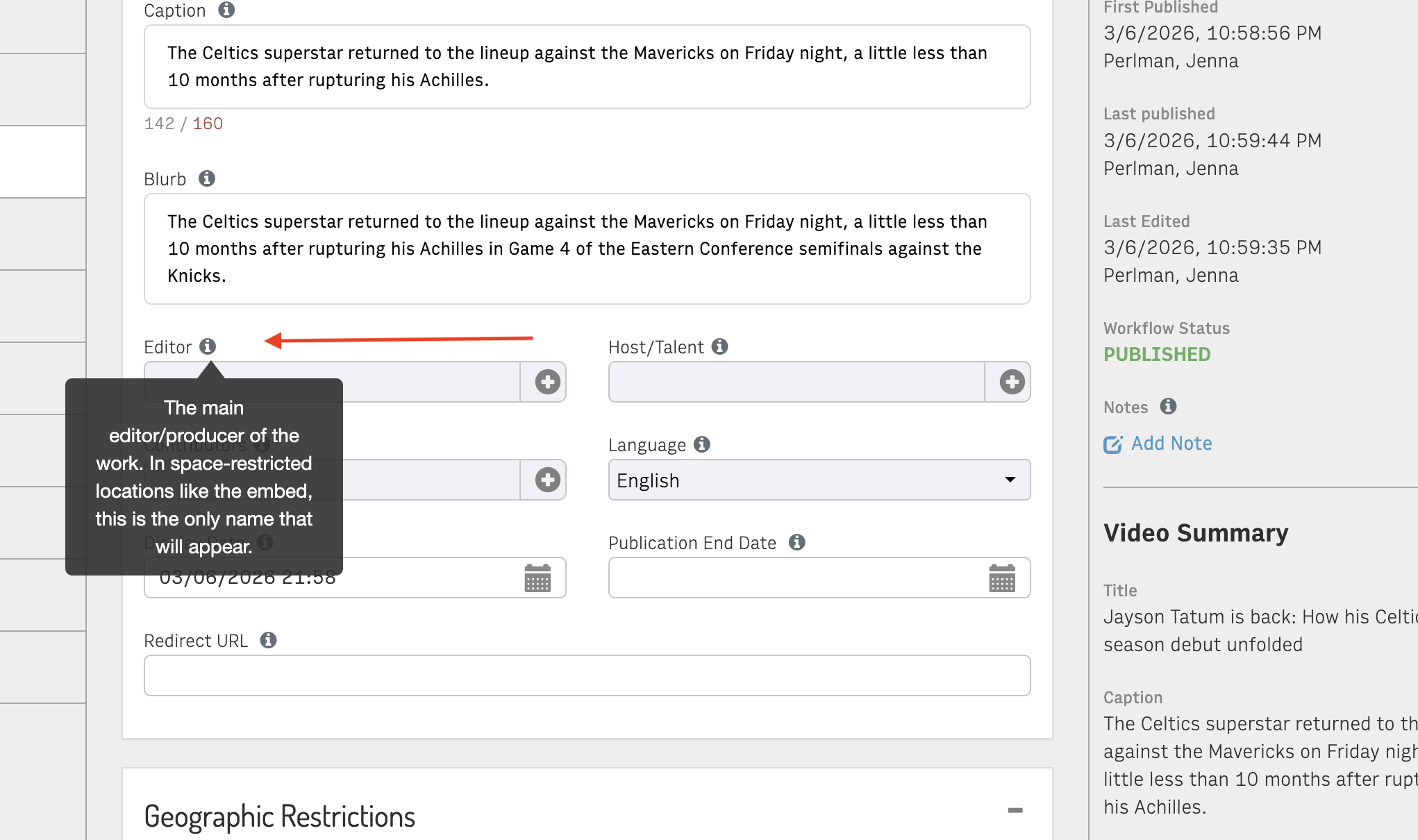 Upvoting this idea. We also use the Editor field for credits. With the new video center UI, the "Credit" field is more prominently displayed. That makes it more confusing for producers because in the previous interface, it was much easier to ignore the Credit field and we had an info box that explained how to use the Editor field and that's not currently an option.